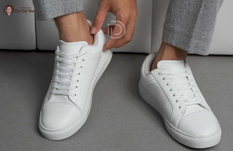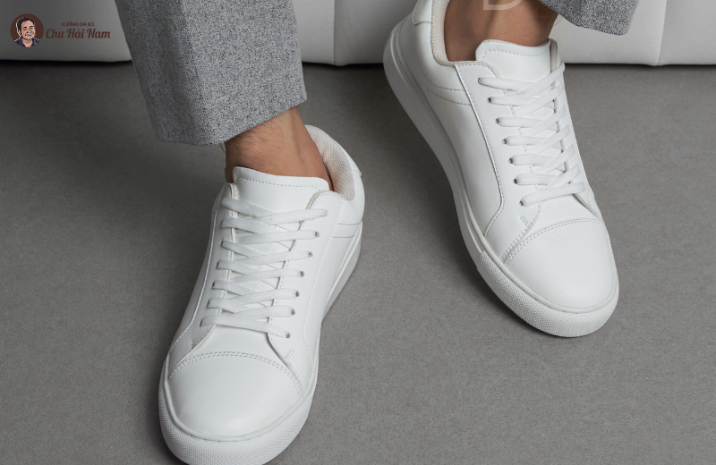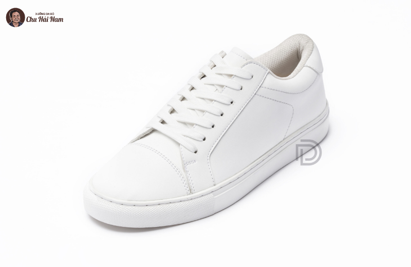 Ở góc ảnh cận, từng đường may nổi lên rõ ràng trên nền da trắng sạch – thể hiện sự chỉn chu trong từng chi tiết. Chất liệu da cao cấp mang lại độ mềm nhưng vẫn giữ bề mặt phẳng đẹp, không bị nhăn hay gãy khi gập chân.