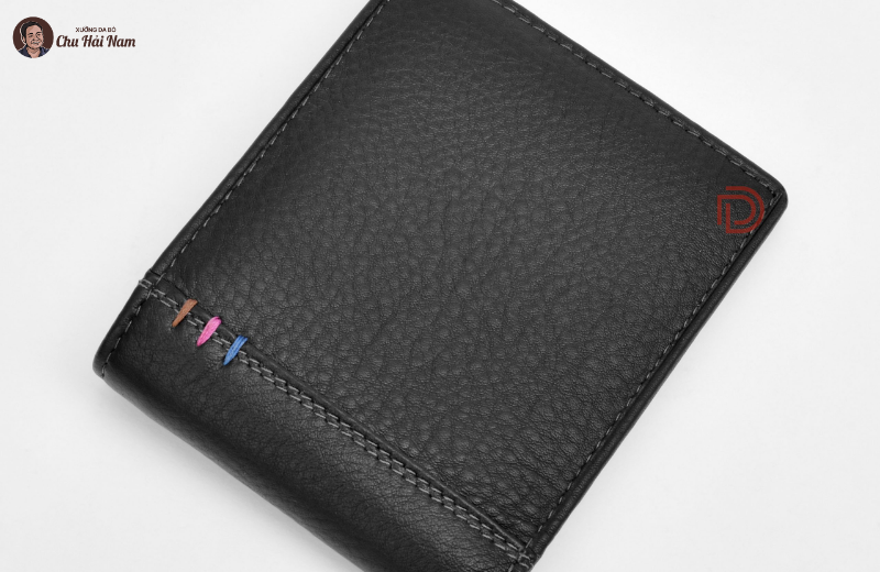 Ở góc cận, bề mặt da hiện rõ vân tự nhiên, cho cảm giác mềm khi chạm tay nhưng vẫn giữ độ đứng form rất tốt. Ba đường chỉ màu thủ công tạo điểm nhấn tinh tế – vừa đủ để ví không bị đơn điệu, vừa làm nổi bật cá tính tinh tế của người sở hữu.