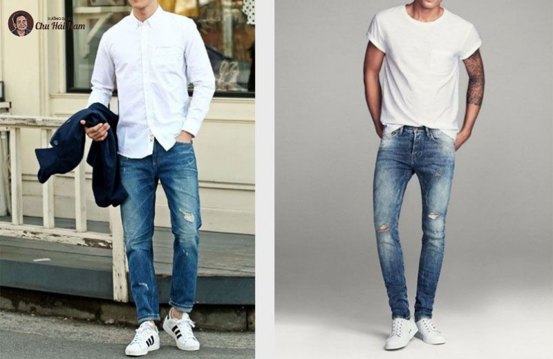 - Nên chọn jeans slim-fit hoặc ống đứng để tổng thể gọn gàng