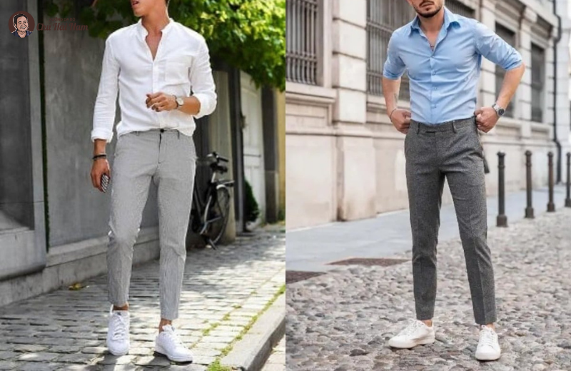 Đây là cách phối dành cho nam giới thích sự hiện đại và phá cách. Giày thể thao giúp quần tây trở nên trẻ trung hơn thay vì quá nghiêm túc.
