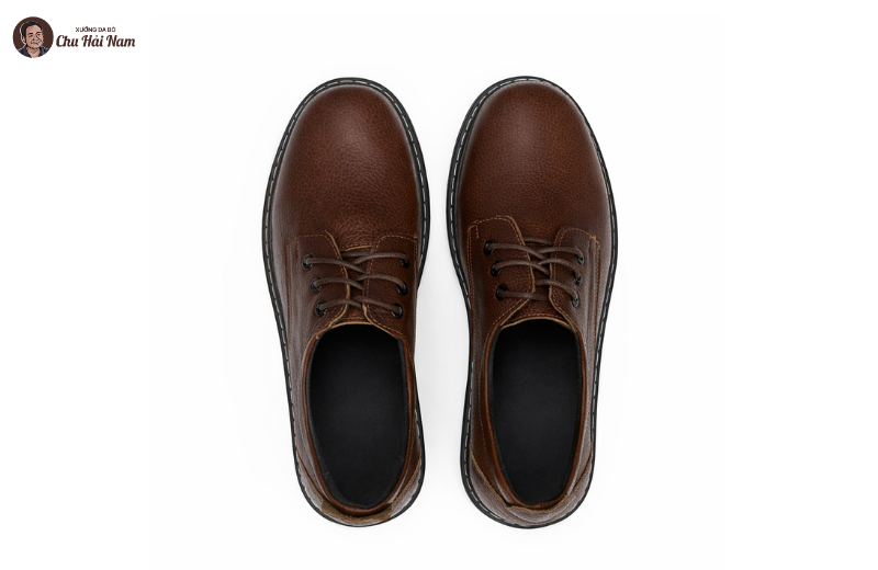 DOC15 gây ấn tượng ngay từ ánh nhìn đầu tiên với chất da bò sần thật dày dặn, bề mặt nhám tự nhiên tạo cảm giác mạnh mẽ và bền bỉ. Khi chạm tay vào, bạn sẽ cảm nhận rõ độ mềm và độ đàn hồi tốt của da, không hề cứng hay thô ráp. Da được xử lý kỹ giúp hạn chế trầy xước và nhăn gãy trong quá trình sử dụng lâu dài. Phần thân giày lên form chuẩn, giữ dáng đứng ngay cả khi mang thường xuyên.