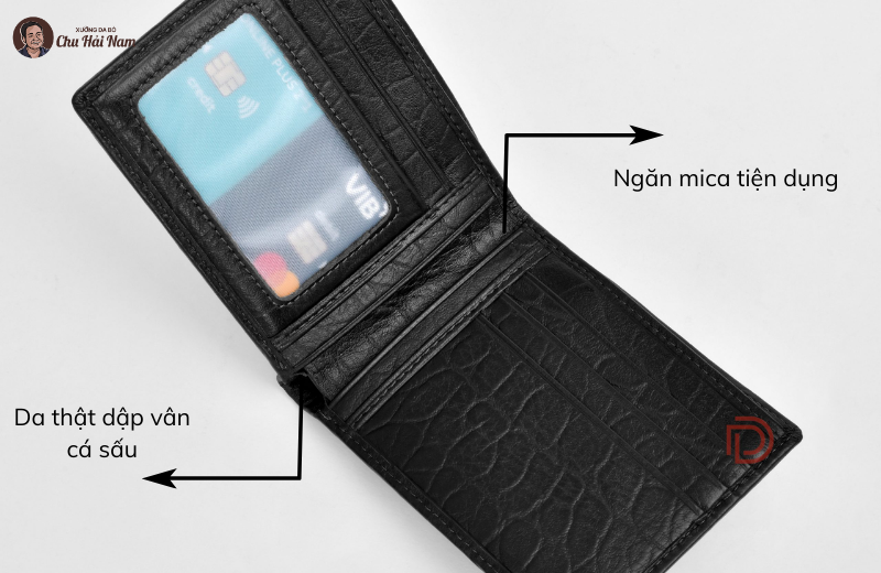 Ở góc cận, vân cá sấu trên da được thể hiện rõ ràng, tạo cảm giác sang trọng ngay khi chạm tay. Mặt trong ví tinh gọn nhưng chia bố cục rất khoa học, từ ngăn thẻ, ngăn mica đến các khe phụ. Sự kết hợp giữa chất da thật và đường may tinh tế giúp tổng thể ví vừa đẹp mắt vừa bền bỉ theo thời gian.