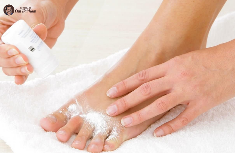 - Thoa phấn rôm đều lên lòng bàn chân và kẽ ngón
